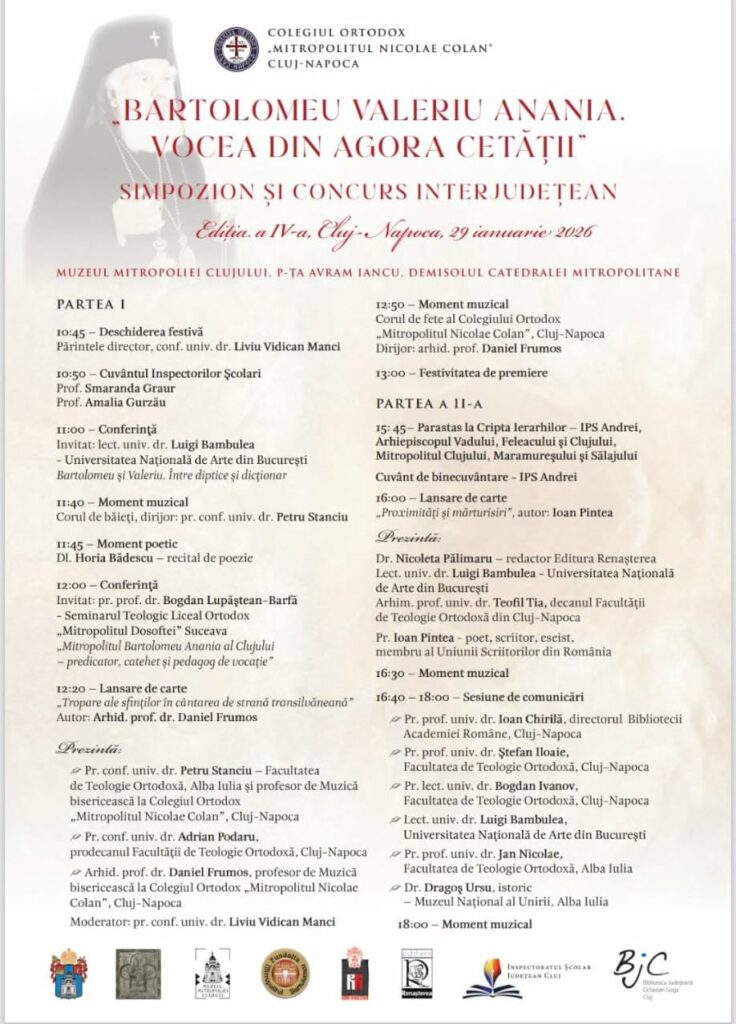 - Simpozionul „Bartolomeu Valeriu Anania. Vocea din agora cetății” → Muzeul Mitropoliei Clujului, Cluj-Napoca, ora 11.00