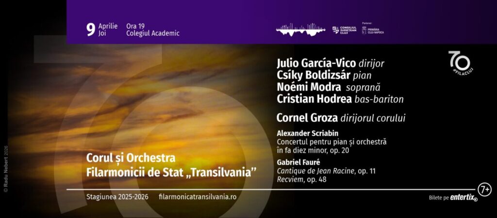 - Concert vocal-simfonic – dirijor Julio García-Vico, Filarmonica de Stat „Transilvania” → Colegiul Academic, Cluj-Napoca, ora 19.00