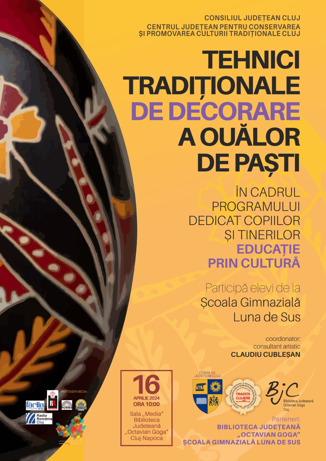 • „Tehnici tradiționale de decorare a ouălor”, Centrul Județean pentru Conservarea și Promovarea Culturii Tradiționale Cluj → Biblioteca Județeană „Octavian Goga”, Cluj-Napoca, ora 10.00
