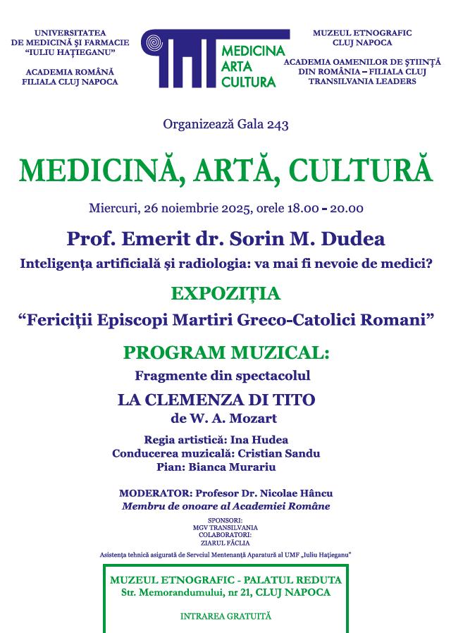 - „Gala 243. Medicină, Artă, Cultură” → Muzeul Etnografic al Transilvaniei, Cluj-Napoca, ora 18.00